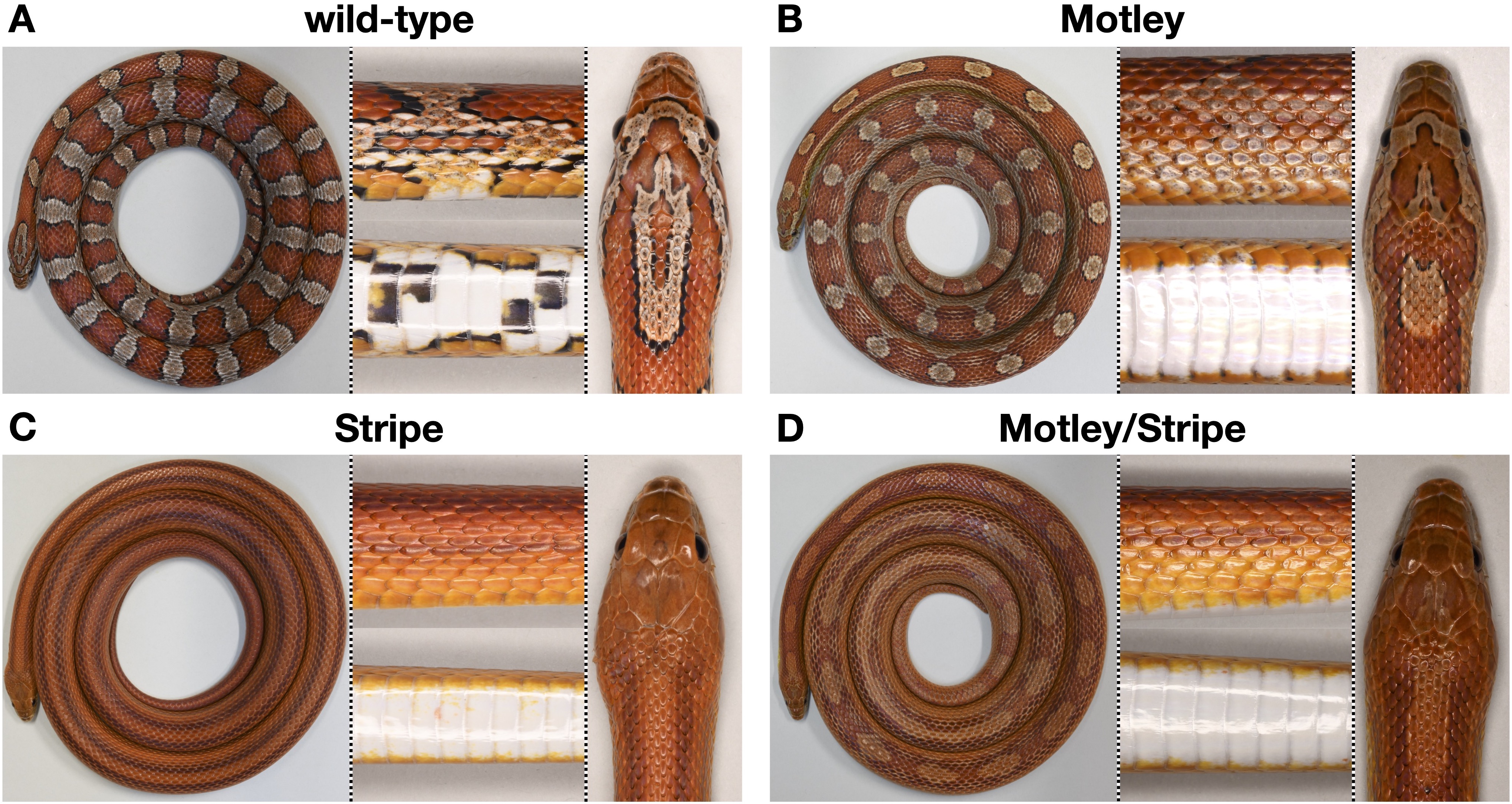 Fig. 1: Color pattern of wild-type, Motley, Stripe, and Motley/Stripe corn snakes. (A) The wild-type pattern consists of dorsal and lateral blotches and black and white ventral checkers. (B) Motley individuals present elongated dorsal blotches that tend to fuse, especially at the anterior part of the body, with highly reduced lateral blotches and white ventral scales. (C) In Stripe individuals, the dorsal and lateral blotches are replaced by four stripes and the ventral scales are also white. Both the motley (mm) and stripe (ms) alleles are fully recessive to the wild-type allele: mm/ + and ms/ + individuals exhibit a wild-type phenotype as in panel A. (D) The phenotype of most mm/mm animals is intermediate, combining fused blotches and stripes.