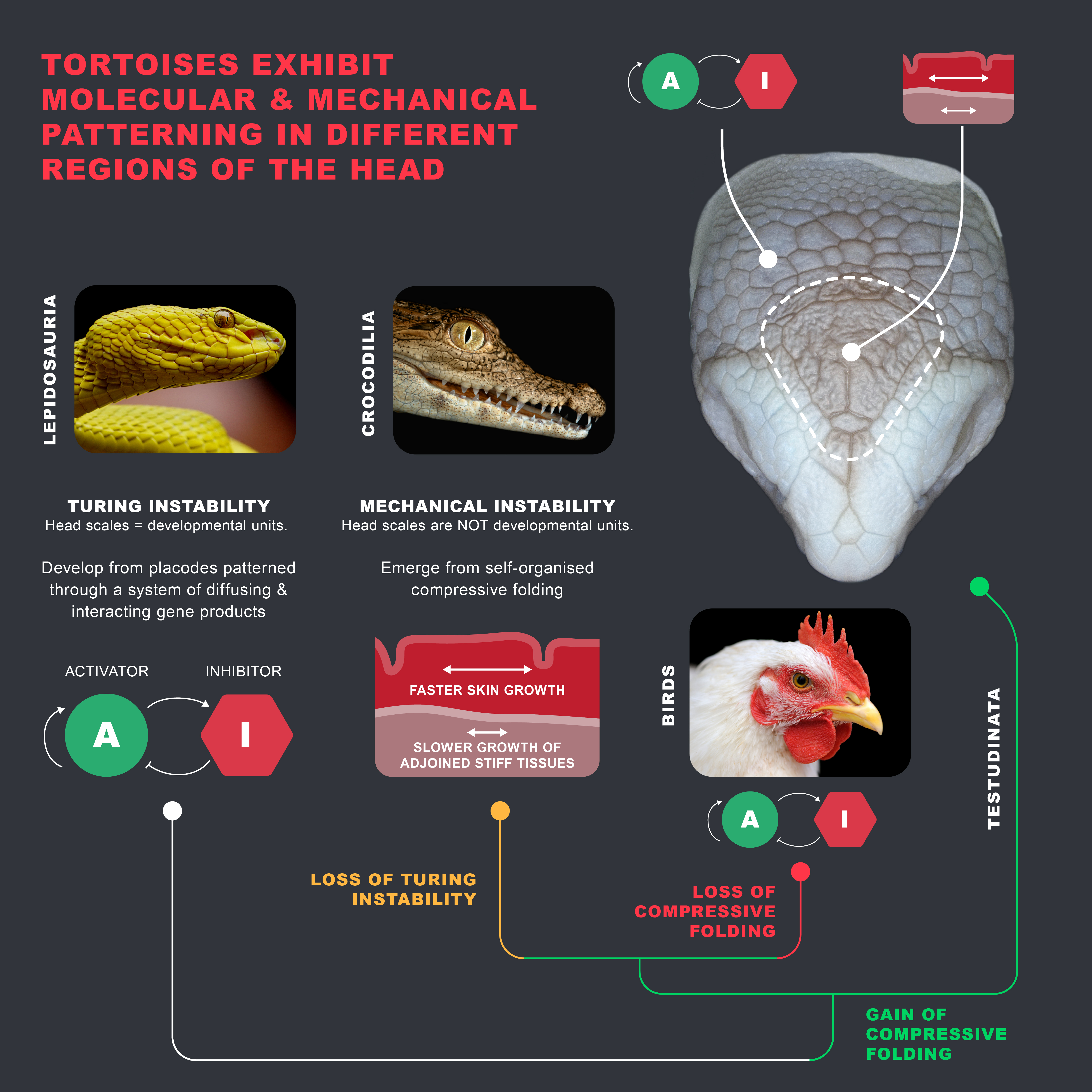 Interestingly, the dual patterning of head scale seen in tortoises —chemical in the periphery, mechanical in the center— bridges characteristics of both squamate reptiles and archosaurs (crocodiles and birds). Since tortoises are the sister group to Archosaurs, our results suggest that mechanical head scale patterning likely evolved in their common ancestor and was later lost in birds.